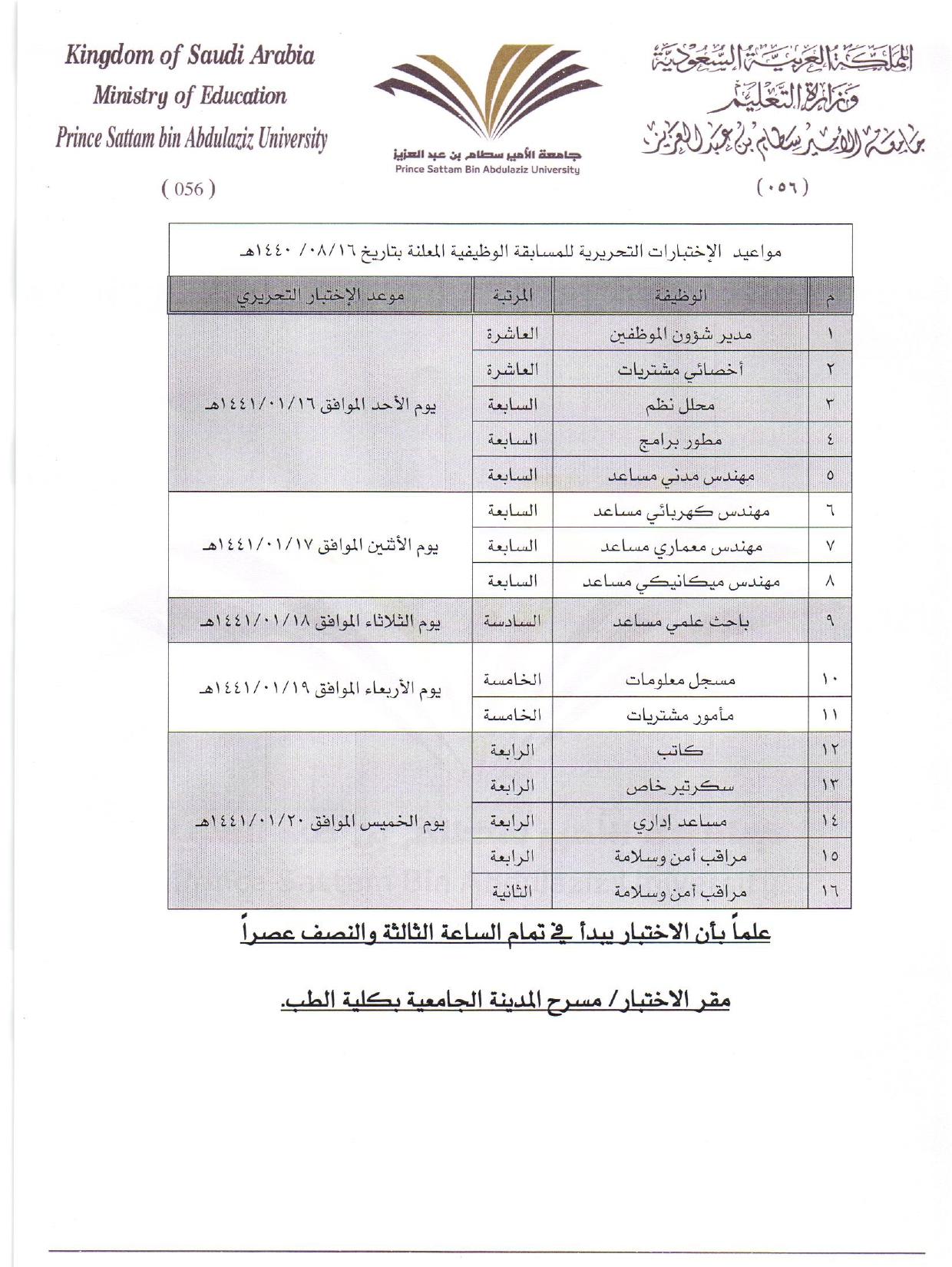 تعلن عمادة الموارد البشرية بجامعة الأمير سطام بن عبدالعزيز عن مواعيد الاختبار التحريري للمرشحين في المسابقة الوظيفية المعلنة بتاريخ 16/8/1440هـ (الإدارية والهندسية) حسب الجدول الموضح أدناه:وبإمكان المتقدمين الدخول على موقع التوظيف الإلكتروني بموقع الجامعة لمعرفة حالة الترشيح. لمعرقة أسماء المرشحين للاختبار اضغط الرابط أدناه:مع ضرورة احتفاظ كل مرشح برقمه التسلسلي الموجود في بيان الأسماء الاختبار التحريري يوم الأحدالاختبار التحريري يوم الإثنينالاختبار التحريري يوم الثلاثاءالاختبار التحريري يوم الأربعاءالاختبار التحريري يوم الخميس