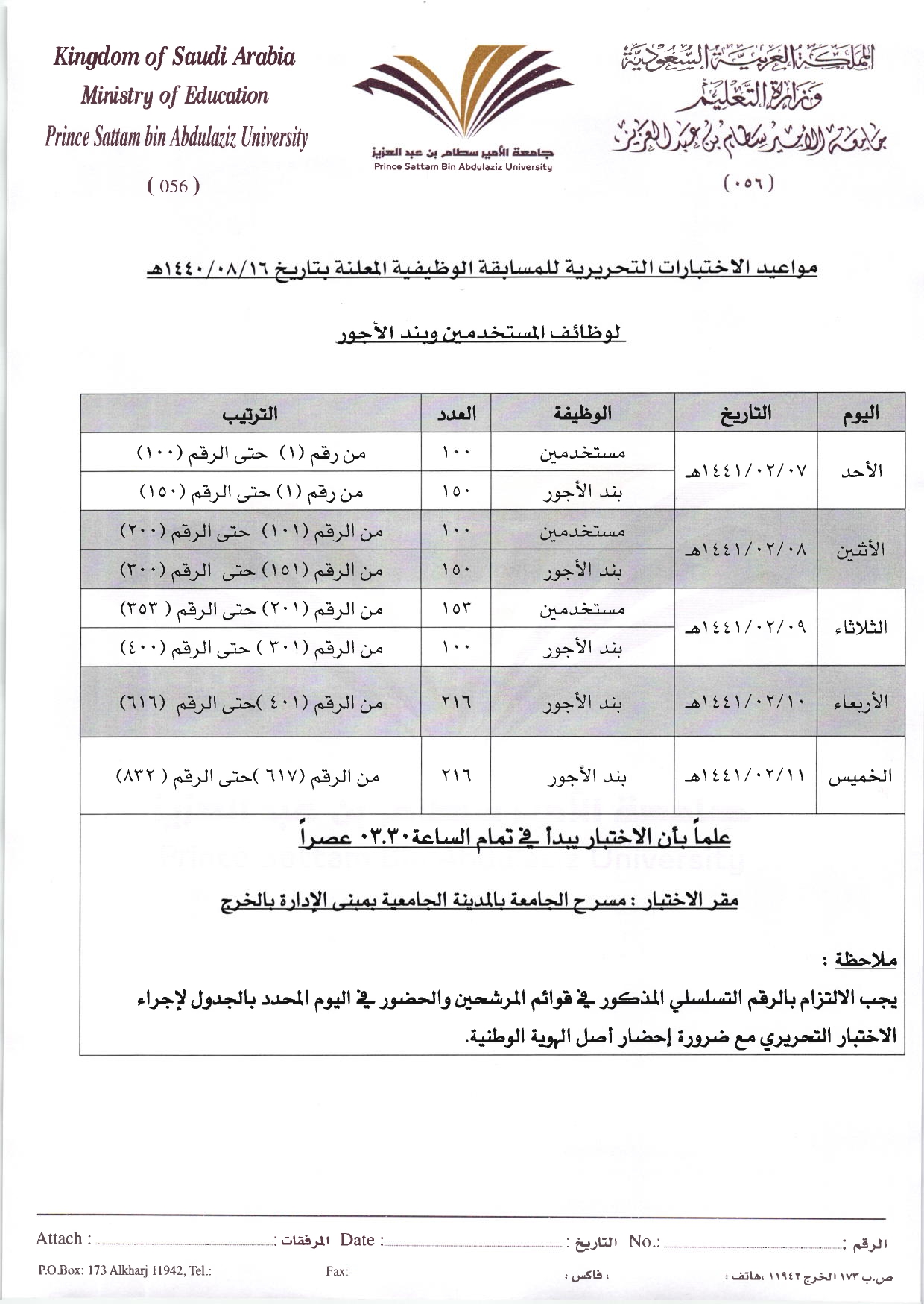 تعلن عمادة الموارد البشرية بجامعة الأمير سطام بن عبدالعزيز عن مواعيد الاختبار التحريري للمرشحين في المسابقة الوظيفية المعلنة بتاريخ 16/8/1440هـ (بند الأجور والمستخدمين) حسب الجدول الموضح أدناه،وبإمكان المتقدمين الدخول على موقع التوظيف الإلكتروني بموقع الجامعة لمعرفة حالة الترشيح. لمعرفة أسماء المرشحين اضغط الرابط أدناه: بند المستخدمينبند الأجورمع ضرورة احتفاظ كل مرشح برقمه التسلسلي الموجود في بيان الأسماء