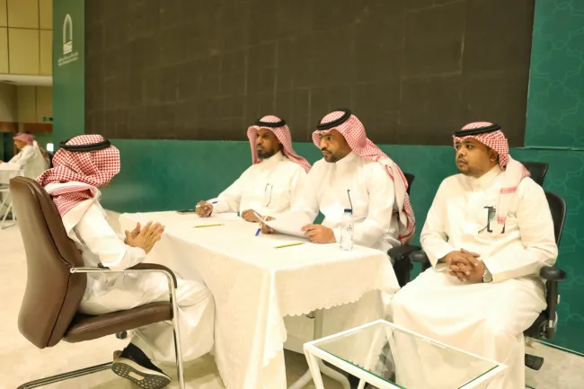 On the morning of Tuesday, 08 Dhu al-Qi'dah 1446 AH, the personal interviews organized by the General Administration of Human Resources began at the university theater in the College of Medicine building. These interviews are for candidates for the tenth and ninth grades, as part of the promotion evaluation procedures for grades ten and below. These interviews come as a preparation for calculating the fourth criterion of the approved evaluation standards, represented by the results of the personal interview to assess the candidates.