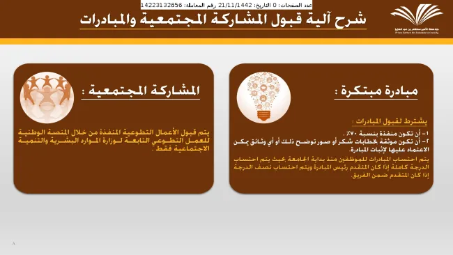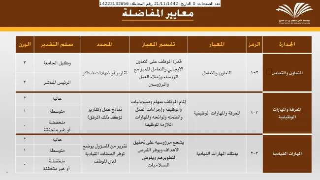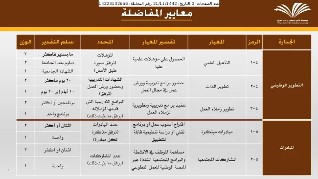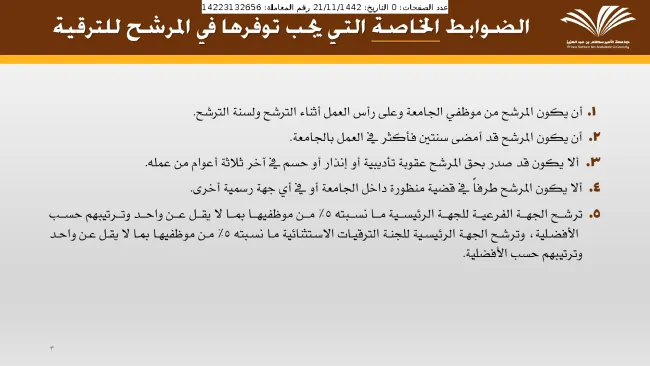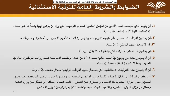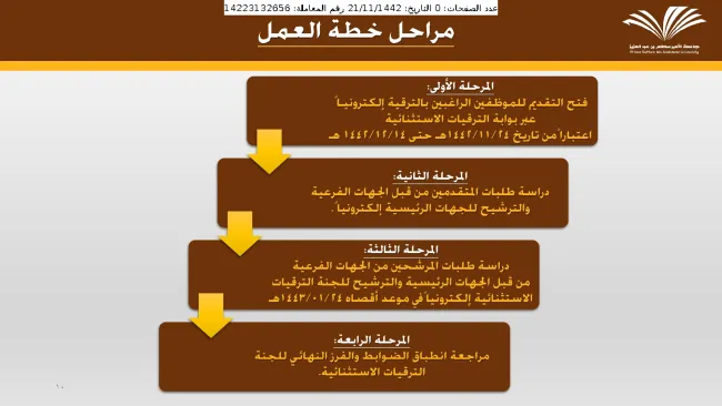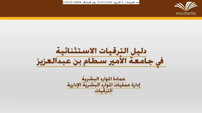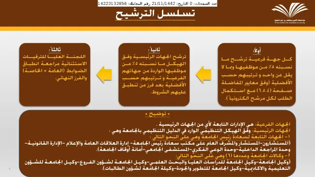 تعلن عمادة الموارد البشرية للموظفين الراغبين في الترقية الاستثنائية والذين تنطبق عليهم الشروط العامة والخاصة الموضحة في الدليل المرفق، التقدم عن طريق البوابة الإلكترونية للترقيات الإستثنائية اعتباراً من تاريخ 24/11/1442هـ وحتى تاريخ 14/12/1442هـ.