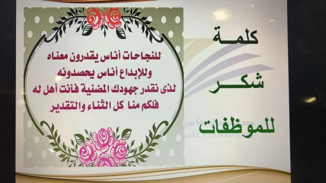 كتب الخبر: محمد بن سعد الحربيتحت رعاية وكيلة العمادة سعادة الدكتورة أريج التويجري أقام القسم النسوي لعمادة شؤون أعضاء هيئة التدريس والموظفين وللسنة الثانية على التوالي، حفل تكريم للموظفات المتميزات في العمادة، والمديرة المتميزة. وفي بداية الحفل ألقت سعادة وكيلة عمادة شؤون أعضاء هيئة التدريس والموظفين الدكتورة أريج التويجري كلمة استهلتها بالترحيب بضيوف الحفل كما قدمت ثنائها وشكرها للموظفات المتميزات، متمنيةً لهن حياة وظيفية حافلة بالعطاء والانجاز والتقدم، وأشارت سعادتها بأن الهدف من التكريم تشجيع الموظفات على التطوير والانجاز من خلال بناء بيئة عمل، تنمي روح التنافس الشريف، لينعكس ذلك على أداء العمادة بشكل عام.كما قدمت شكرها للقائمين على الحفل وأشادت بكفاءة إعداده وتنظيمه.وبعد ذلك استمرت فقرات الحفل والتي تضمنت تعريف بأقسام العمادة وانجازاتها.وفي نهاية الحفل سلمت سعادة الوكيلة الموظفات المتميزات شهادات التقدير والجوائز وهن:1- منيره المسعود2- هند العمري3- حنان اليوسف4- الجوهرة اليمني5- شيخه الخطيفيوكرمت سعادتها المديرة المتميزة الأستاذة/ مريم بنت راشد الدليمي مديرة علاقات شؤون عضوات هيئة التدريس والموظفات وأثنت على انجازاتها الرائدة والمستمرة والتي كان لها الأثر في تطور أداء القسم النسوي في العمادة.كما كرمت الموظفات المشاركات في إعداد وتنظيم الحفل وهن:1- وضحى الحمدان2- ساره الجوير3- نوره الشمران4- هند العمري5- مريم الدليمي6- شيخه العثمانوجدير بالإشارة أن الحفل كان ناجحاً بكافة المقاييس حيث أعربت سعادة الوكيلة والحضور عن سعادتهم بهذا التنظيم الرائع والذي نال إعجاب الجميع.