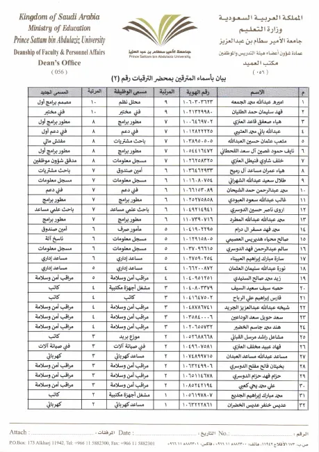 وافق معالي مدير جامعة الأمير سطام بن عبدالعزيز على ترقية عدد (32) موظفاً وموظفة من المرتبة العاشرة وحتى المرتبة الثانية في محضر الترقية رقم (2) للعام المالي 1438/1439هـ،وذلك لتوفر شروط شغلها واكمال الموظفين المدة النظامية لإستحقاق الترقية.صرح بذلك سعادة عميد شؤون أعضاء هيئة التدريس والموظفين أد. مشرف بن أحمد الزهراني، وبارك سعادته للموظفين والموظفات المترقين متمنياً لهم حياة عملية حافلة بالعطاء والإنجاز.والموظفون والموظفات المرقون هم