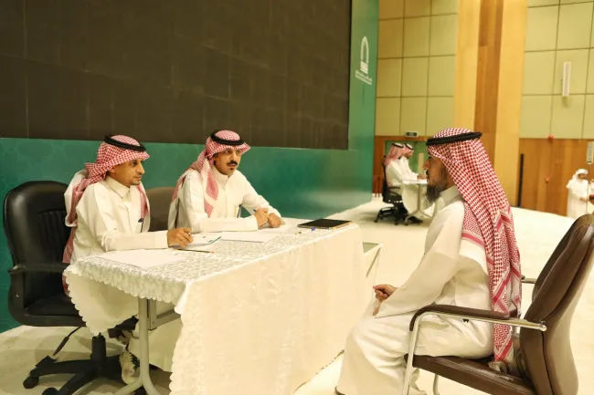 On the morning of Tuesday, 08 Dhu al-Qi'dah 1446 AH, the personal interviews organized by the General Administration of Human Resources began at the university theater in the College of Medicine building. These interviews are for candidates for the tenth and ninth grades, as part of the promotion evaluation procedures for grades ten and below. These interviews come as a preparation for calculating the fourth criterion of the approved evaluation standards, represented by the results of the personal interview to assess the candidates.